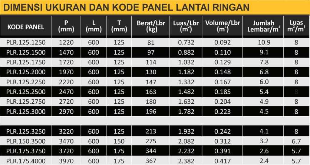 Lebar panel lantai yaitu 60 Cm dan tebal 12,5 Cm, 15 Cm, 17,5 Cm.. Untuk spesifikasi lengkapnya bisa dilihat pada gambar dibawah ini